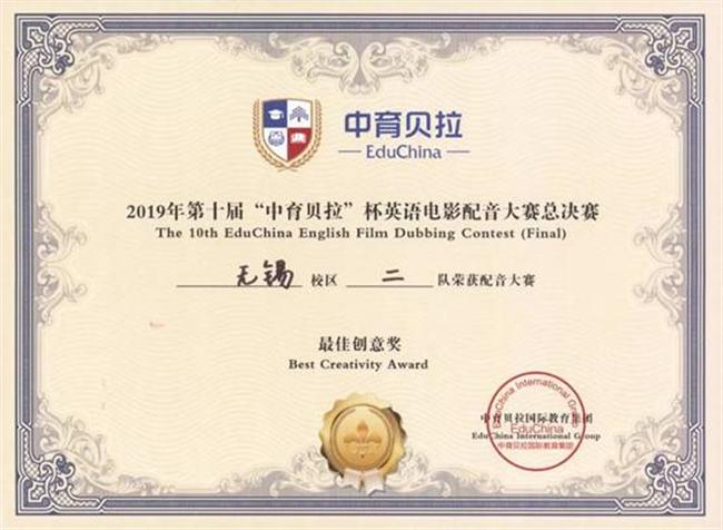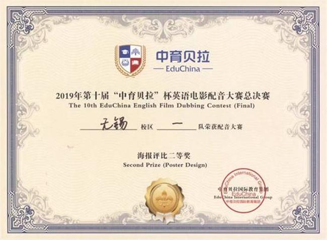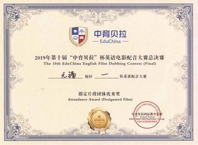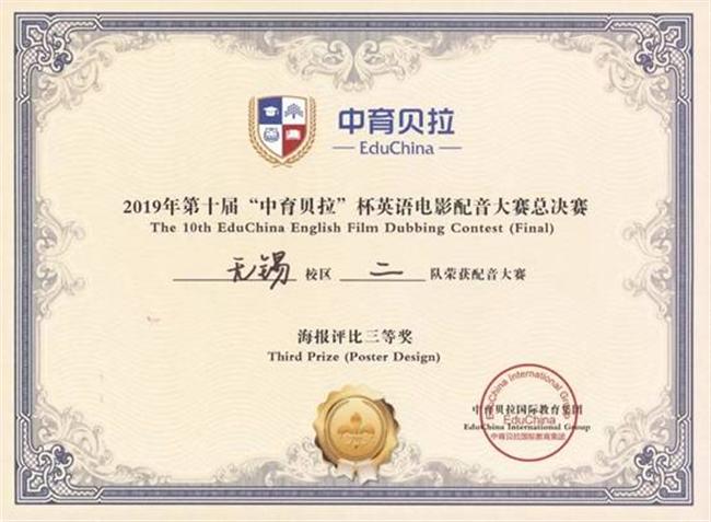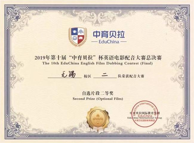第十届“中育贝拉杯”英文电影配音大赛全国总决赛于11月30日在京圆满落幕。我校国际部选派的两支队伍均取得了优异的成绩。其中王博、舒一壤、应凯乐、吴兆益、李珏清、柏成鑫小组获得了指定片段团体优秀奖。邵宇杰、杨子为、张博阳、任怡然、应凯乐小组获得了自选片段二等奖和最佳创意奖。两个小组还分别获得了海报评比二等奖和三等奖的好成绩。邵宇杰同学还获得了本次比赛的自选片段“配音之星”称号。