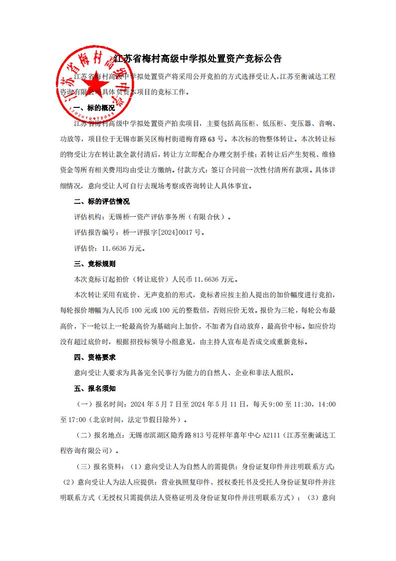 江苏省梅村高级中学拟处置资产竞标公告