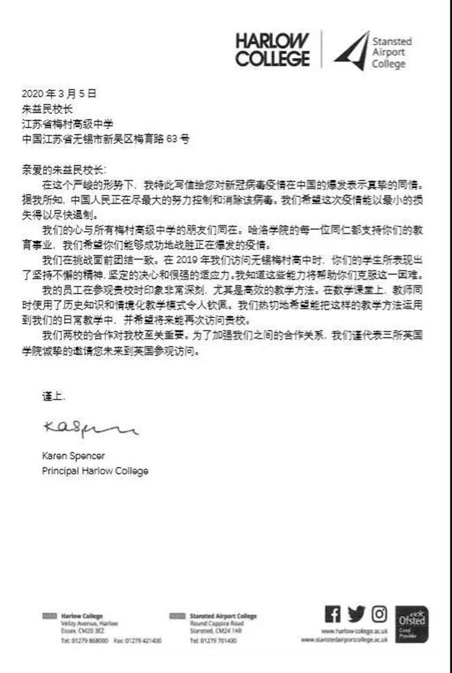 Karen校长在信中表示,“我们的心与所有梅村高级中学的朋友们同在。哈洛学院的每一位同仁都支持你们的教育事业,希望你们能够成功地战胜正在爆发的疫情。”同时,Karen校长还对我校的教学质量给予由衷的赞赏。