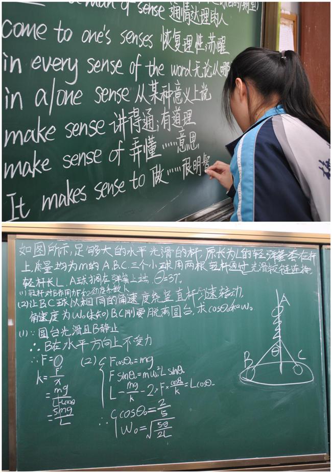 A:自然是我们班上的学习角和解题角。每天都会有同学在黑板上分享学习笔记。另外我们班还成立了学习小组,下课总能见到同学们热火朝天地讨论题目。