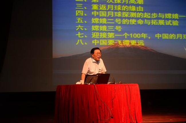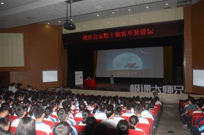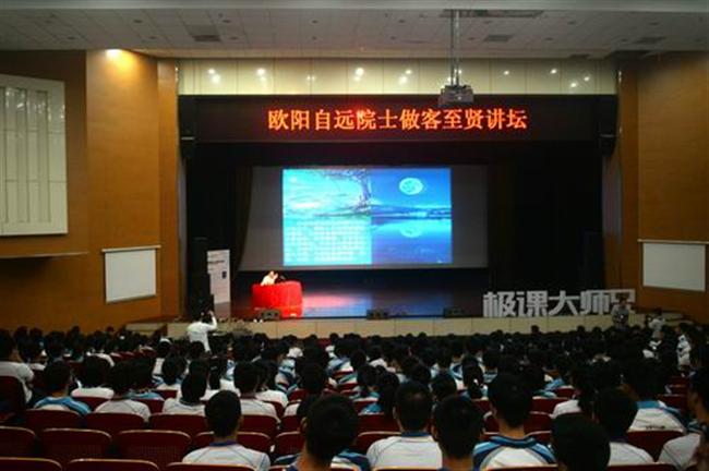 15:15,欧阳自远院士走进梅村高中报告厅,雷鸣般的掌声经久不息。至贤讲坛上,欧阳自远院士以“中国的探月梦”为题,详细介绍了月球对人类的重大意义、月球探测的历程与成果、“嫦娥工程”的成果及规划等。他还谈到了中国深空探测的初步设想,勾勒了一幅宏伟的蓝图,包括火星探测、太阳探测、小行星探测、金星探测、木星探测等,表达了“中国要飞得更远”的梦想。报告图文并茂、数据翔实、通俗易懂、激动人心,多次赢得师生长时间的热烈掌声。