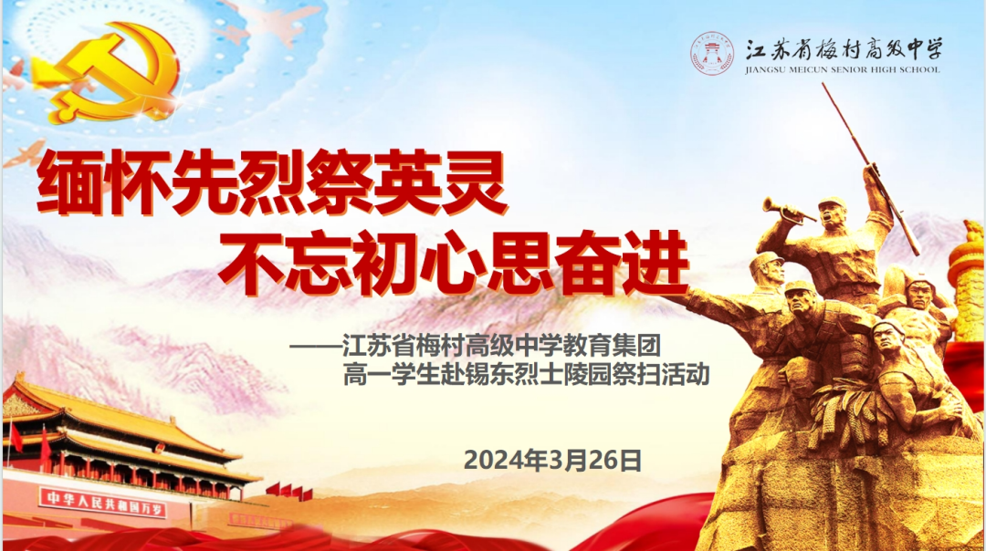 在清明节来临之际,为了缅怀革命先烈,加强爱国主义教育,近日,江苏省梅村高级中学教育集团高一年级全体师生徒步前往锡东革命烈士陵园,举行以“缅怀先烈祭英灵,不忘初心思奋进”为主题的清明祭扫暨爱国教育社会实践活动。