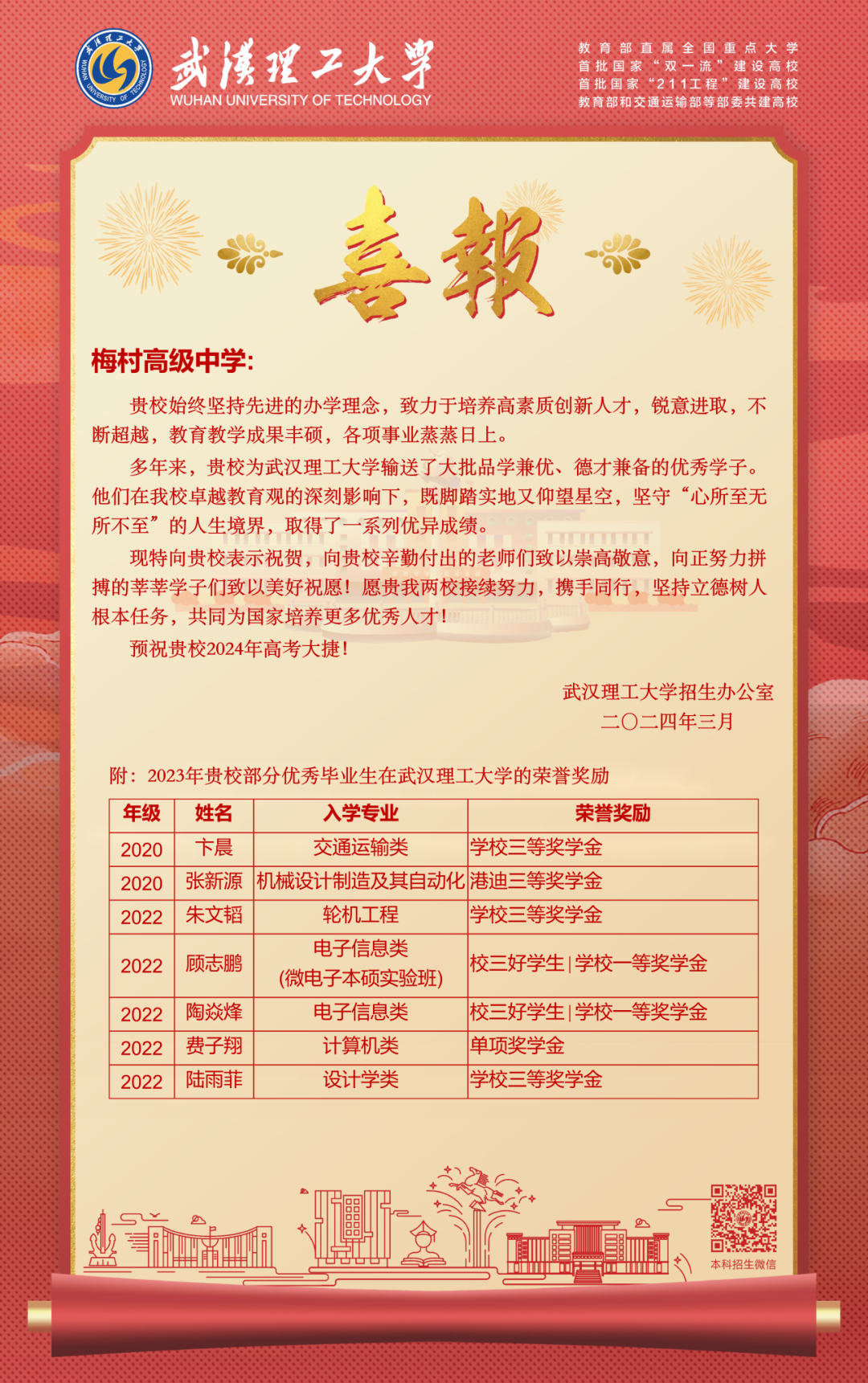 武汉理工大学理学院党委书记余峰详细介绍了该校的历史沿革、专业概况、学习环境及就业前景,深入解读了武汉理工大学的招生政策,为梅中学子生涯规划提供了很多有参考价值的信息。余书记也高度赞扬了梅中学子进入武理工后的优异表现,表达了未来与我校更加深入、更加广泛合作的愿望。