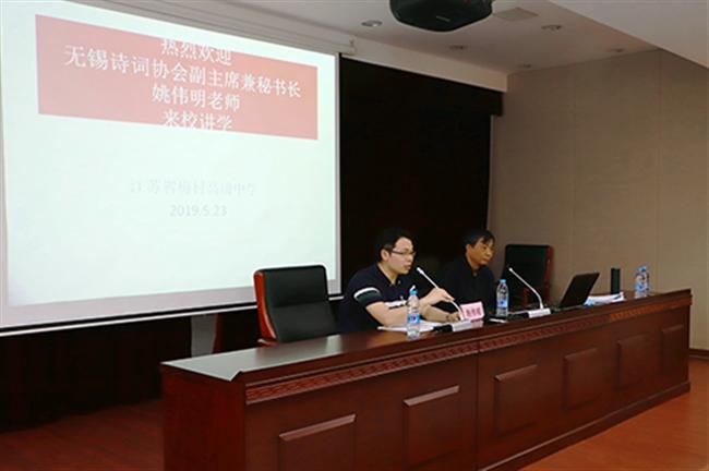 近日,梅村高中吴韵诗社的同学们在学术交流中心道德讲堂聆听了无锡市诗词协会副会长兼秘书长姚伟明老师的讲座,学习了关于格律诗词创作的基本技能。