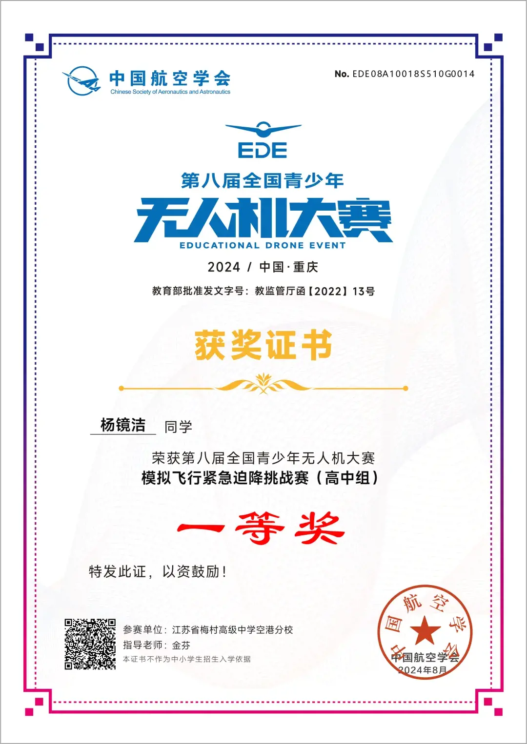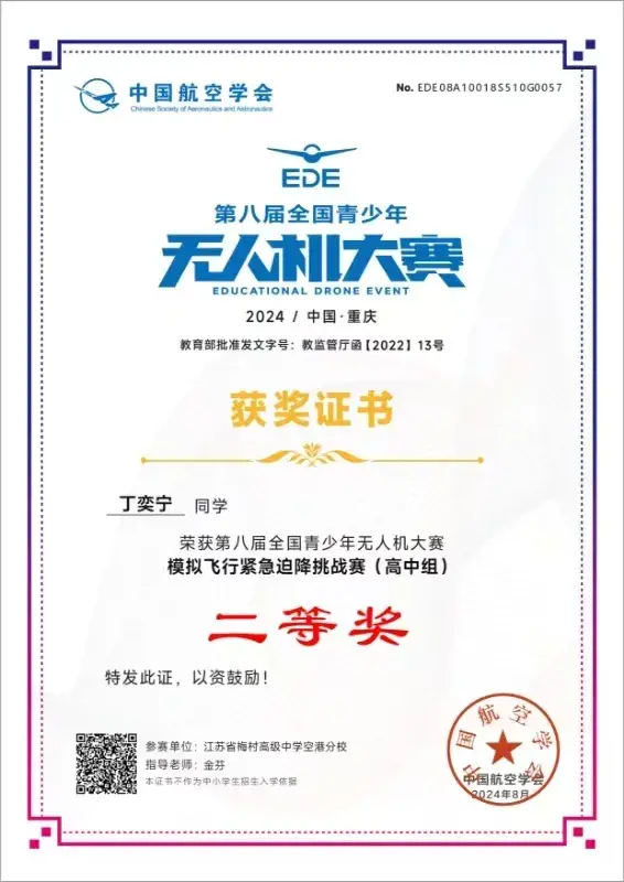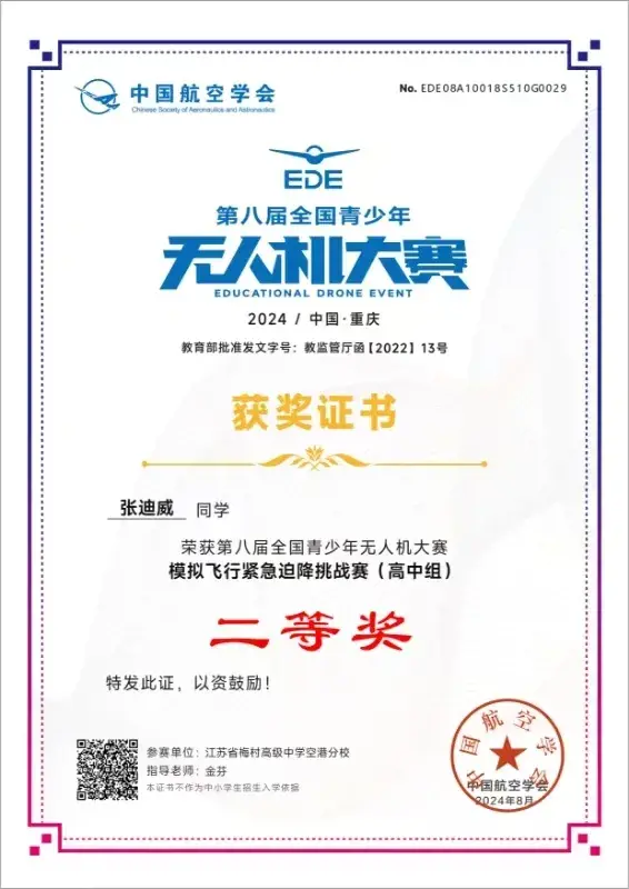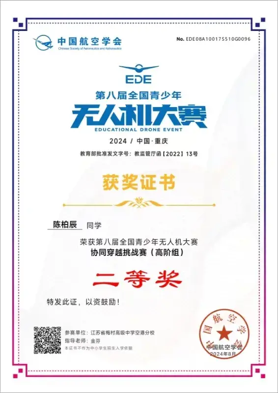 在第八届全国青少年无人机大赛中,江苏省梅村高级中学教育集团的34名学生取得了1个全国一等奖、9个全国二等奖、19个全国三等奖的好成绩。