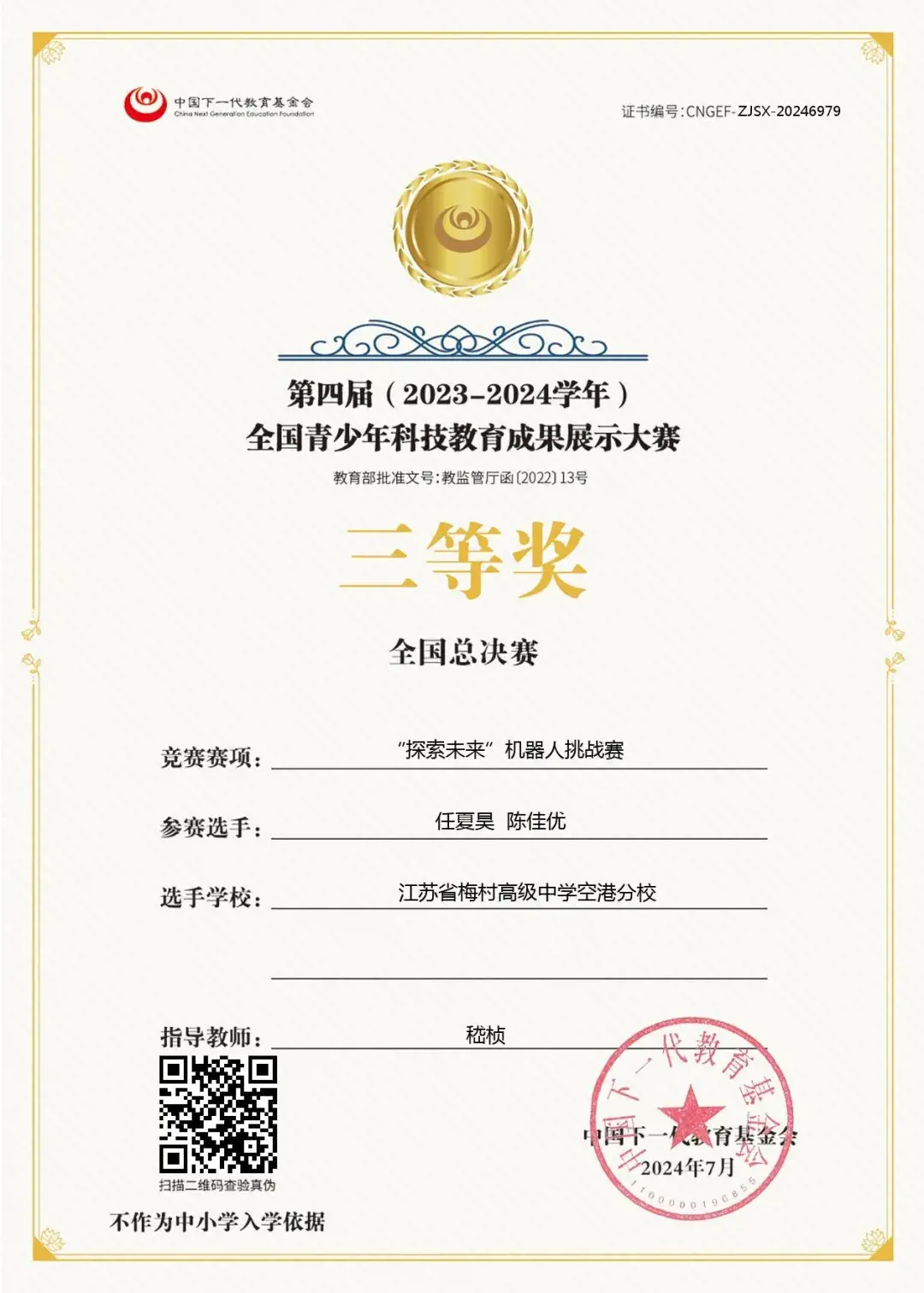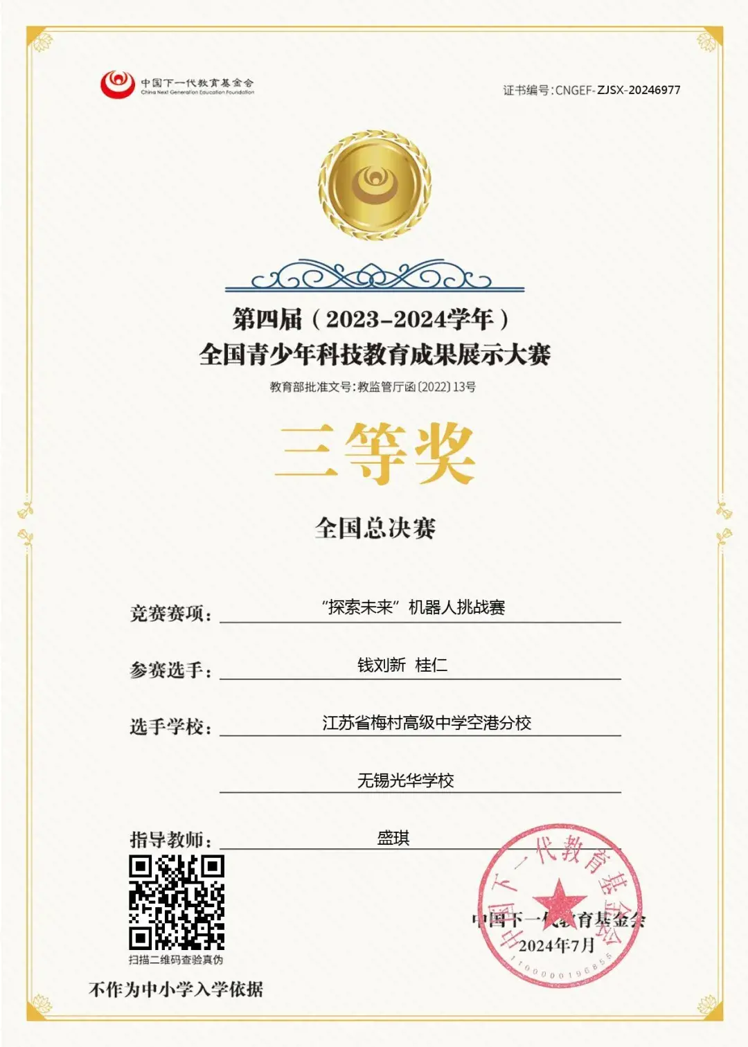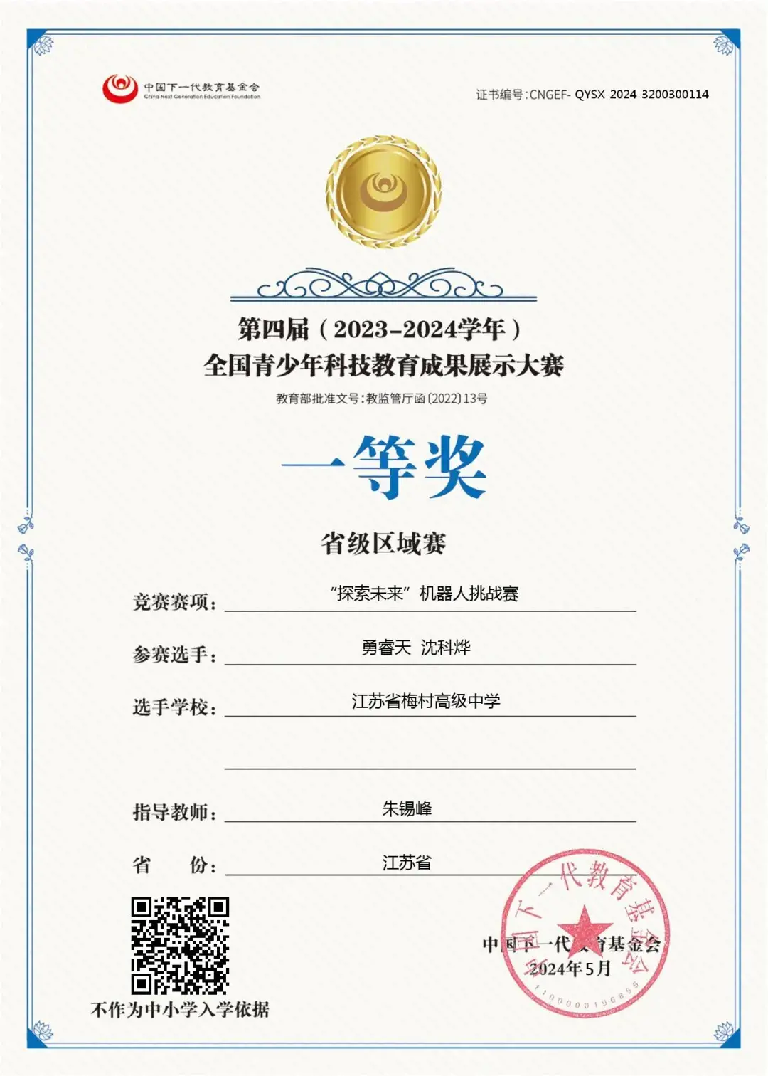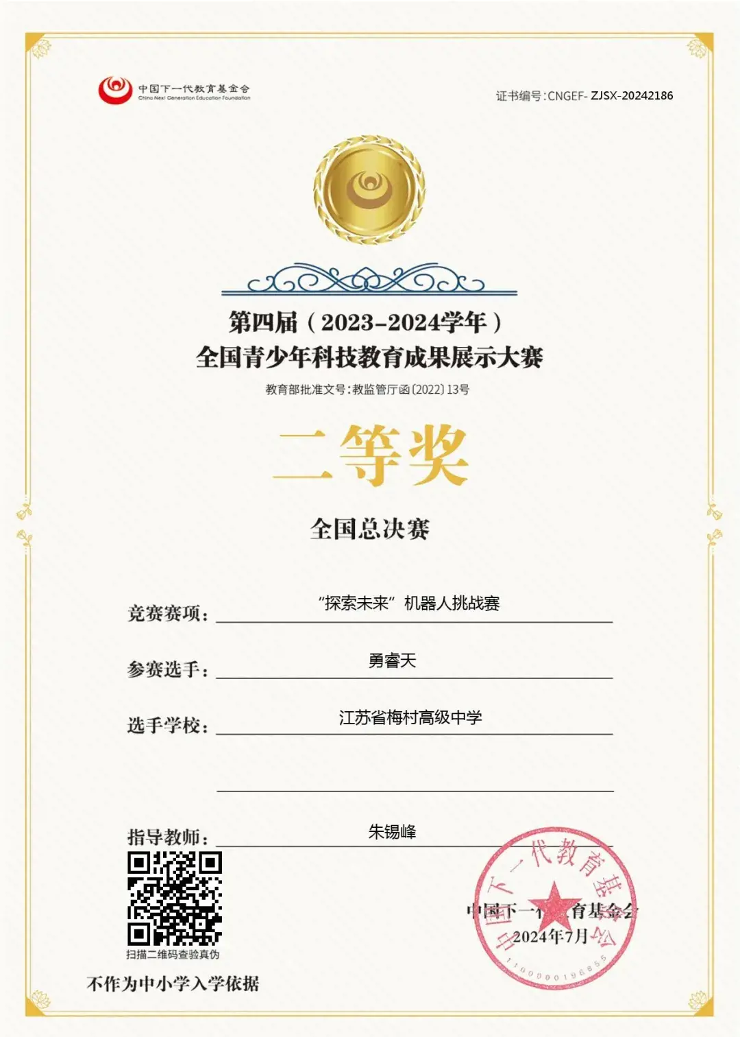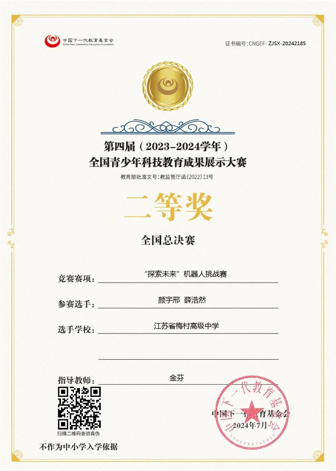 在2024全国青少年科技教育成果展示大赛暨“探索未来”机器人挑战赛中,江苏省梅村高级中学教育集团的9名同学获得省一等奖晋级国赛并参加7月在浙江举办的总决赛,取得3个全国二等奖、6个全国三等奖的好成绩。