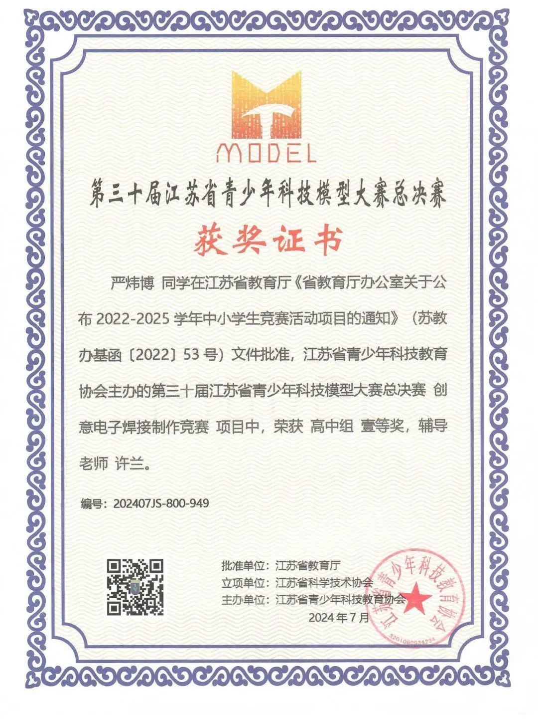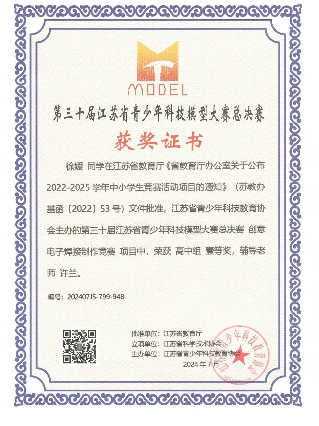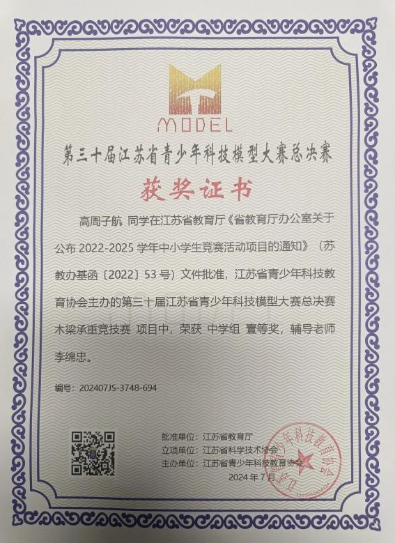 7月8日至14日,在第三十届江苏省青少年科技模型大赛总决赛中,梅村高中高周子航、邹心悦、李张诚3位同学,空港分校严炜博、徐媛、周越、王麒栋、卞正杰、李炎轩6位同学均获得省总决赛优异成绩。