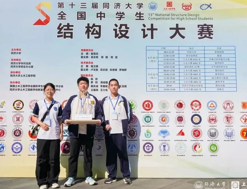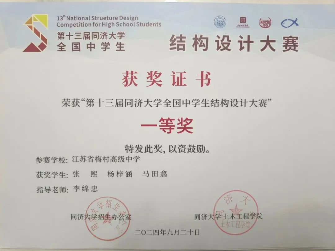 9月20日至22日,在第十三届同济大学全国中学生结构设计大赛中,梅村高中张熙、杨梓涵、马田翕3位同学在李绵忠老师指导和带领下,在3天时间中,现场设计制作出全场最轻的抗震结构模型,并成功通过静荷载和地震波测试,以优异的成绩荣获全国一等奖。