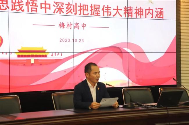 10月19日,梅村高中启新思政大讲堂“学悟伟大精神,争当领跑先锋”主题党日活动正式启动。在活动中,学校党委书记华继承带领全体党员认真学习《习近平总书记在全国抗击新冠肺炎疫情表彰大会上的讲话》和《习近平总书记在纪念中国人民抗日战争暨世界反法西斯战争胜利 75 周年座谈会上讲话》,深入理解“生命至上、举国同心、舍生忘死、尊重科学、命运与共”的伟大抗疫精神。深刻感悟中国人民敢于压倒一切困难而不被任何困难所压倒的顽强意志以及国家利益至上、人民利益至上、全局利益至上的伟大民族精神。
