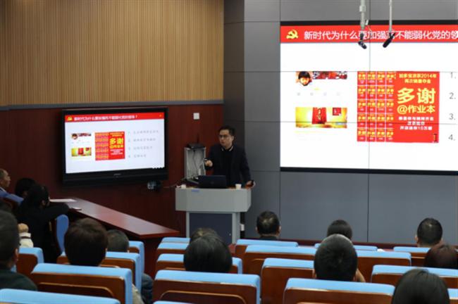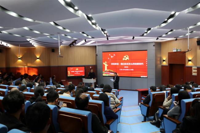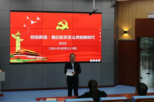 为深入推进“不忘初心、牢记使命”主题教育走深走实,引导全校党员教师坚定理想信念,不断在真学真信真用的过程中锤炼忠诚干净担当的政治品格,11月11日下午,学校特邀请江南大学马克思主义学院教授唐忠宝作“我们处在怎么样的新时代”专题讲座,学校全体党员老师聆听了报告。讲座由党委书记华继承主持。