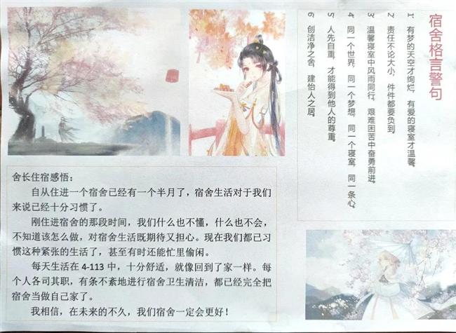 宿舍生活中,宝贵的是在共同生活的空间中一起创造的灿如繁星的记忆。舍友同伴间,不仅仅是一声简单的称呼,更是不同灵魂的碰撞。宿舍生活的每一帧,舍友相处的每一瞬都是动听的故事。本次宿舍文化创建活动的第三项内容以“秀宿舍风采,展个性魅力”为主题,要求各宿舍成员一起制作彰显宿舍风采的宣传海报,并且此项活动将伴随着学生的宿舍生活持续进行,由各班级或各宿舍自行不定期替换展示。在活动过程中,各宿舍充分发挥各自所长,展示出一幅幅精彩的画作,这些活灵活现的作品承载着室友间的脉脉温情。
