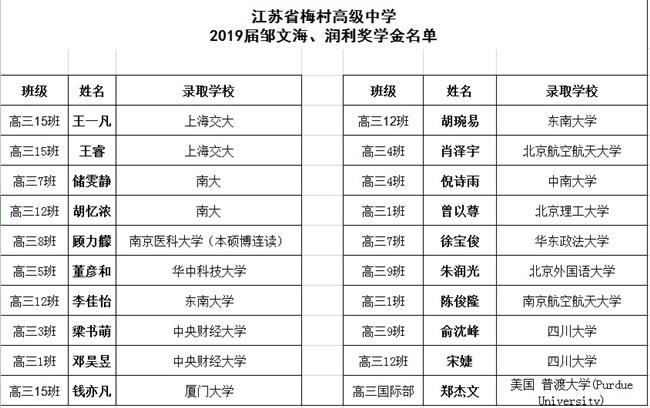 梅村高中的奖学金激励制度已实行多年。1995年开始设立“邹文海奖学金”,2013年后又分别设立了“包志方奖学金”和“润利奖学金”。“邹文海奖学金”“润利奖学金”共计20位,旨在表彰取得优异高考成绩的优秀毕业生;“包志方奖学金”30位,旨在嘉奖各年级优秀学生。期望他们不忘初心,永葆优秀本色,做一个对社会有贡献的人。