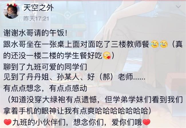 作为一个刚刚进入西浦的大一新生,在这次母校行活动中,感触颇多。最直白的第一感觉,就是又重温了母校的回忆。回到那个我们曾经奋斗过的地方,虽然昔日同窗好友早已不在,但是睹物思人,校园内的一景一物,仍旧拨动着心中的涟漪,昔日往事的酸甜苦辣仿佛依旧历历在目。而更深层次 的,是这次活动真真切切的给人一次锻炼自我的机会。过去因为努力学习,学生大多没有这种自己组织一场活动的机会与经历,但是母校行活动就给了我们这样的机会,从准备资料,考虑向学弟、学妹讲什么,再到联系学校,贴海报宣传,走班介绍,最后在阶梯教室演讲,答疑。当然,这对于我们来说固然是一种挑战,但也是一种成长,面对全新的情境,不断地试错,调整, 直至最合理的方案,这给了我们一种全新的体验。(任天辰)